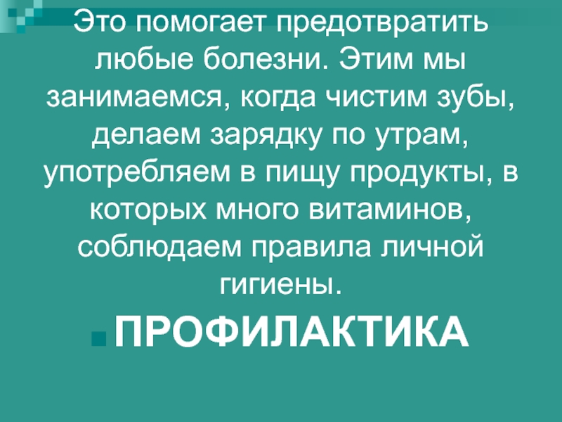 Слайд 57Это помогает предотвратить любые болезни. Этим мы занимаемся, когда чистим зубы,