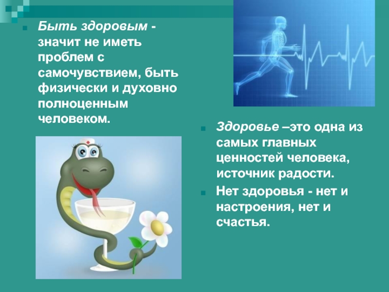 Слайд 5Быть здоровым - значит не иметь проблем с самочувствием, быть физически