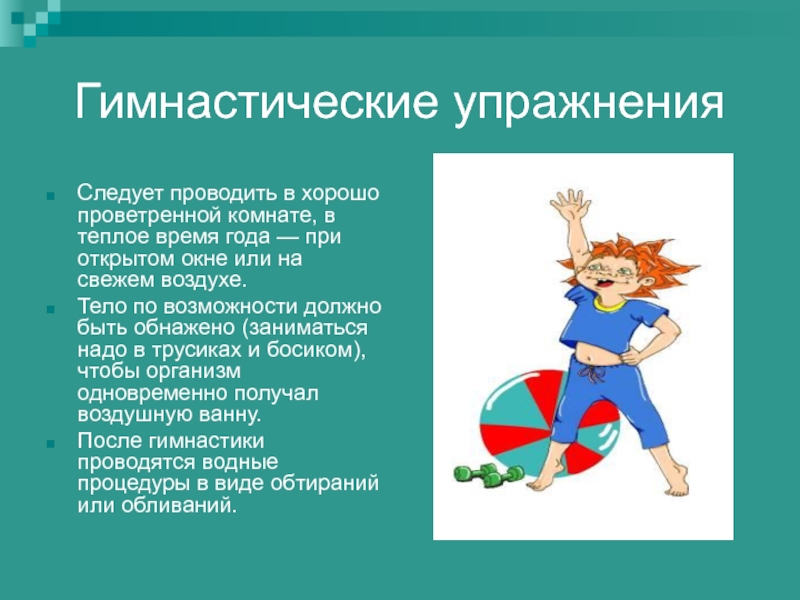 Гимнастические упражнения усиливают работу сердца и легких, улучшают обмен веществ, благотворно действуют на нервную систему.