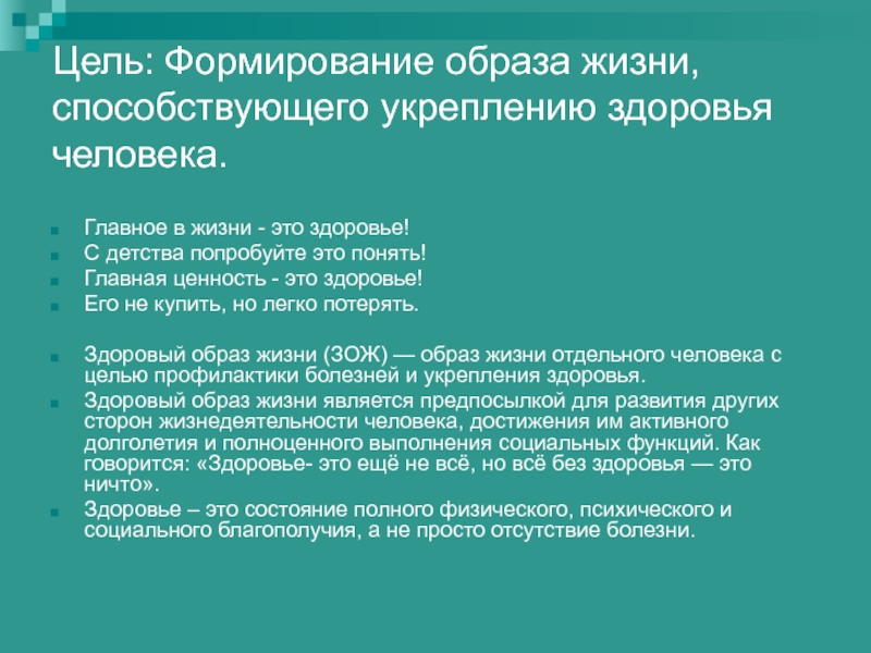 Слайд 3Цель: Формирование образа жизни, способствующего укреплению здоровья человека.
