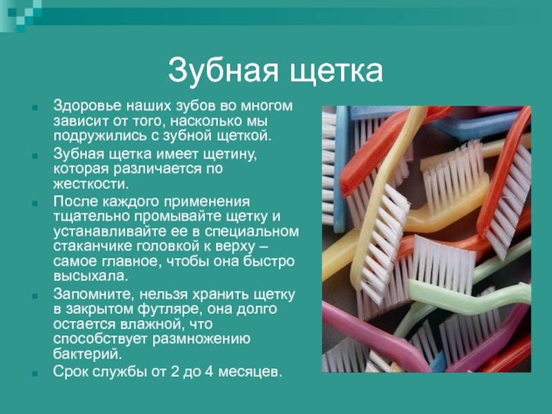 Запомните, нельзя хранить щетку в закрытом футляре, она долго остается влажной, что способствует размножению бактерий.