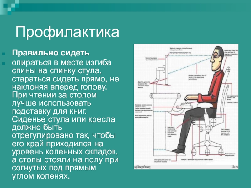 сидеть прямо, не наклоняя вперед голову. При чтении за столом лучше использовать подставку для книг. Сиденье стула или кресла должно быть отрегулировано так, чтобы его край приходился на уровень коленных складок, а стопы стояли на полу при согнутых под прямым углом коленях.
