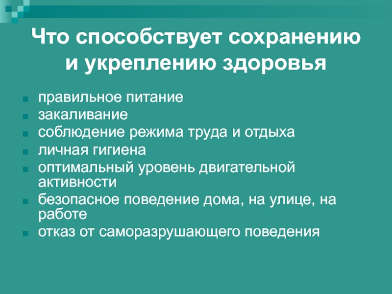 Слайд 7Что способствует сохранению и укреплению здоровья