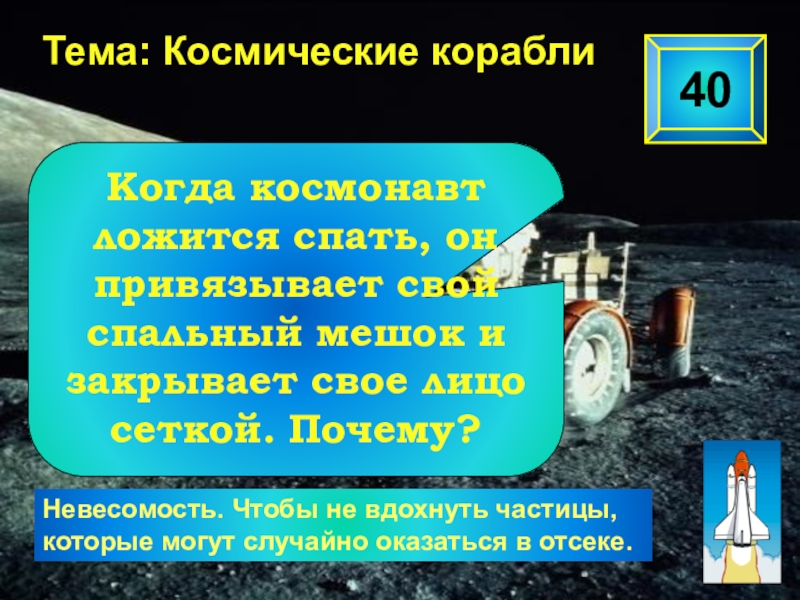 Когда космонавт ложится спать, он привязывает свой спальный мешок и закрывает свое лицо сеткой. Почему?