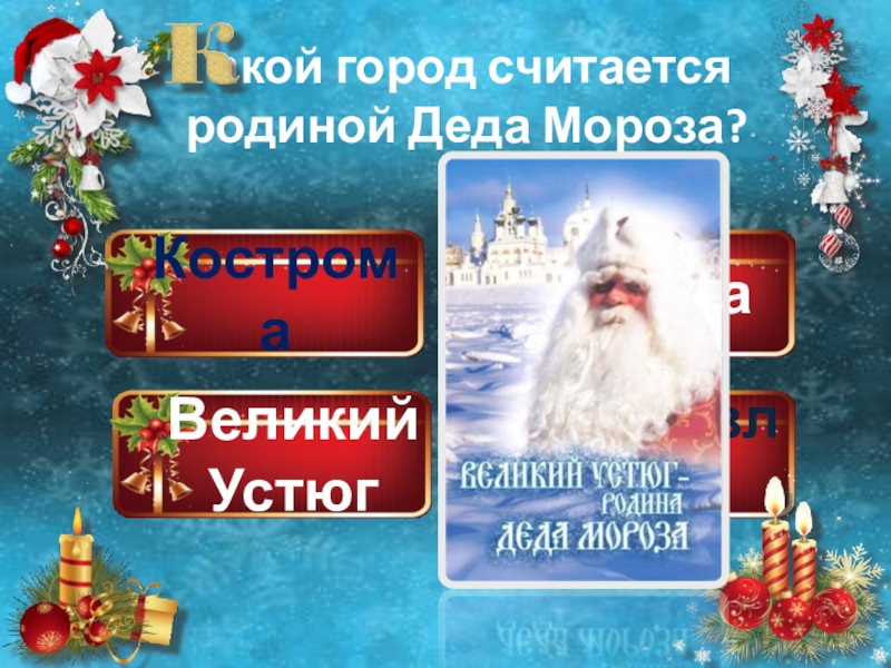 Кострома Великий УстюгМоскваЯрославль акой город считается родиной Деда Мороза?
