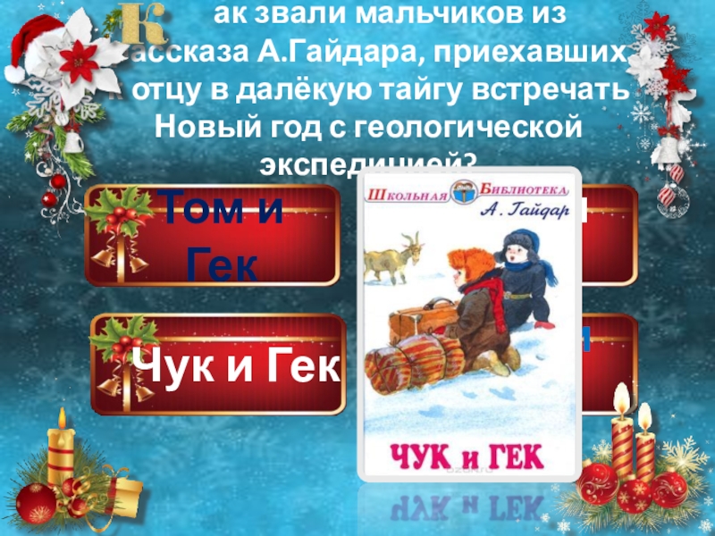 ак звали мальчиков из рассказа А.Гайдара, приехавших к отцу в далёкую тайгу встречать Новый год с геологической экспедицией?