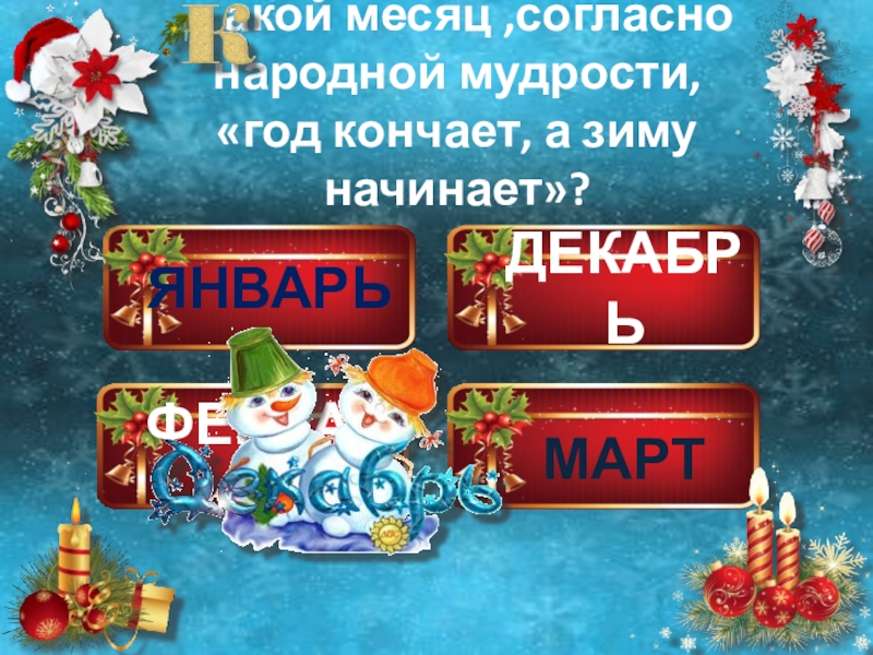 ЯНВАРЬДЕКАБРЬФЕВРАЛЬМАРТ  акой месяц ,согласно народной мудрости, «год кончает, а зиму начинает»?