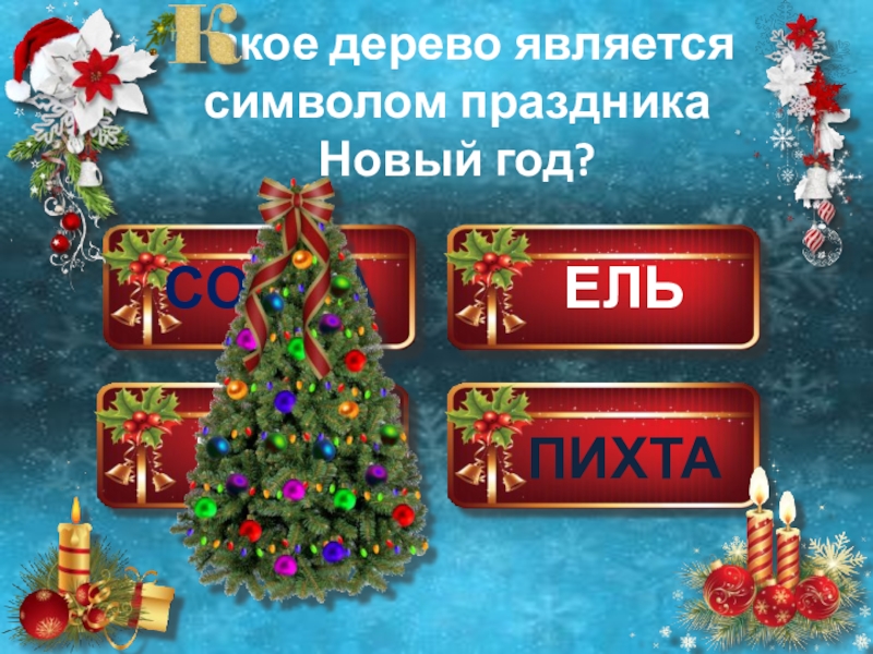СОСНАЕЛЬКЕДРПИХТА  акое дерево является символом праздника  Новый год?