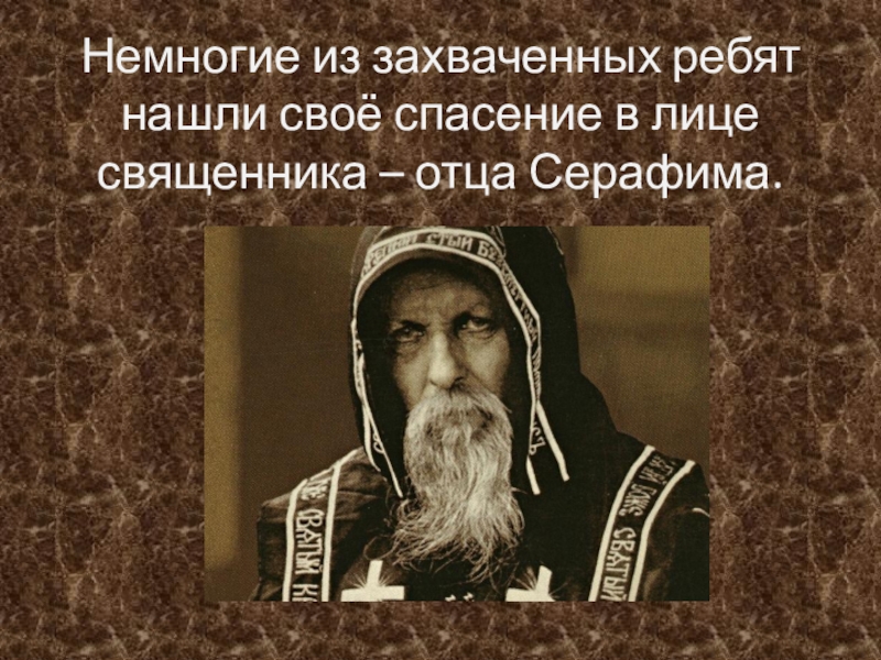 Слайд 5Немногие из захваченных ребят нашли своё спасение в лице священника –