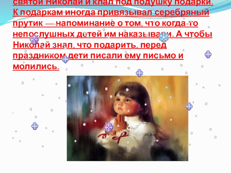 Николай и клал под подушку подарки. К подаркам иногда привязывал серебряный прутик — напоминание о том, что когда-то непослушных детей им наказывали. А чтобы Николай знал, что подарить, перед праздником дети писали ему письмо и молились.