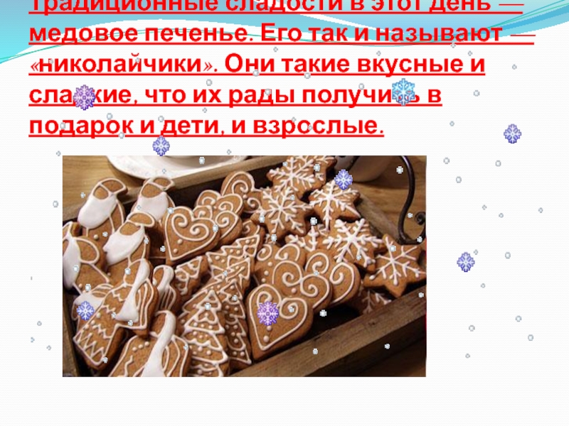 Традиционные сладости в этот день — медовое печенье. Его так и называют — «николайчики». Они такие вкусные