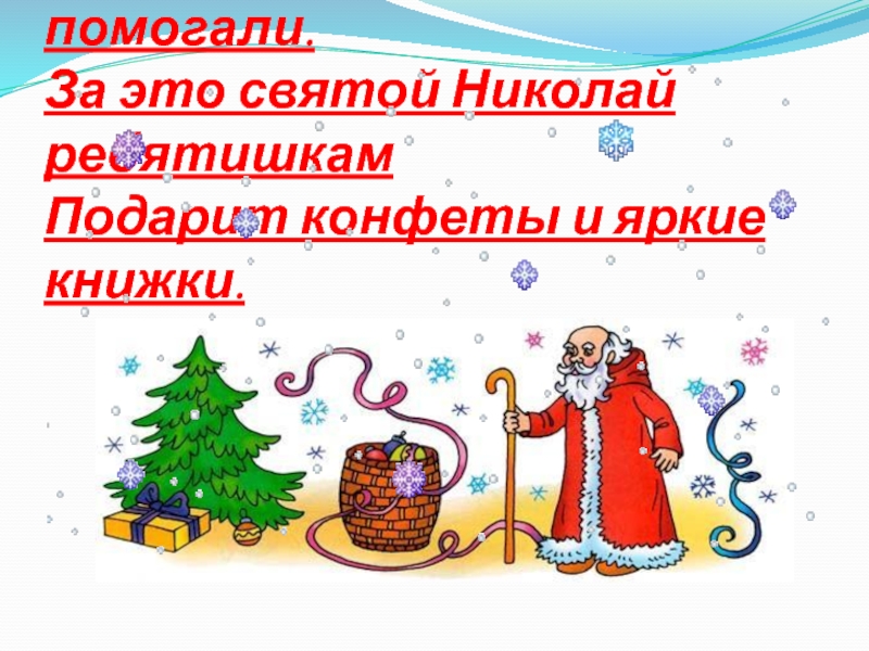 Неделю ребята учились, читали, Старались и маме во всём помогали. За это святой Николай ребятишкам Подарит конфеты и яркие книжки.