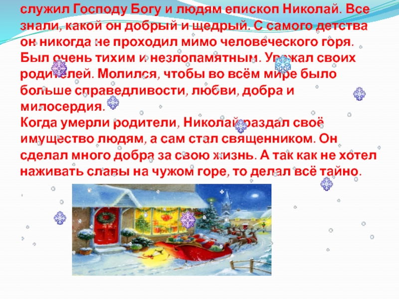 этот гость с неба, которого с нетерпением ожидают дети? Когда-то очень-очень давно жил в одном городе, служил Господу Богу и людям епископ Николай. Все знали, какой он добрый и щедрый. С самого детства он никогда не проходил мимо человеческого горя. Был очень тихим и незлопамятным. Уважал своих родителей. Молился, чтобы во всём мире было больше справедливости, любви, добра и милосердия. Когда умерли родители, Николай раздал своё имущество людям, а сам стал священником. Он сделал много добра за свою жизнь. А так как не хотел наживать славы на чужом горе, то делал всё тайно.