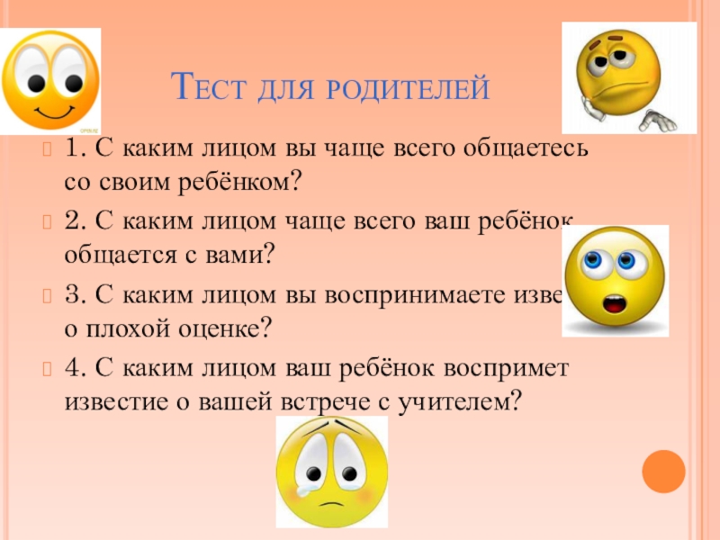 Тест для родителей1. С каким лицом вы чаще всего общаетесь со своим ребёнком?2. С каким лицом чаще всего ваш ребёнок общается с вами?3. С каким лицом вы воспринимаете известие о плохой оценке?4. С каким лицом ваш