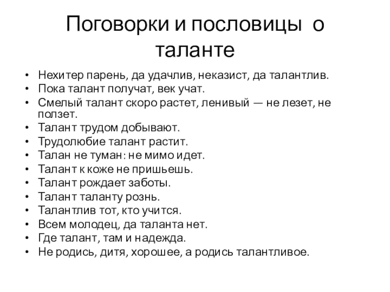 Поговорки и пословицы о талантеНехитер парень, да удачлив, неказист, да талантлив.Пока талант получат, век учат.Смелый талант скоро