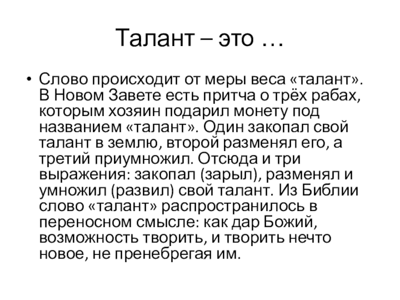 Талант – это … Слово происходит от меры веса «талант». В Новом Завете есть притча о трёх рабах, которым хозяин подарил монету под названием «талант». Один закопал свой талант в землю, второй разменял его, а третий