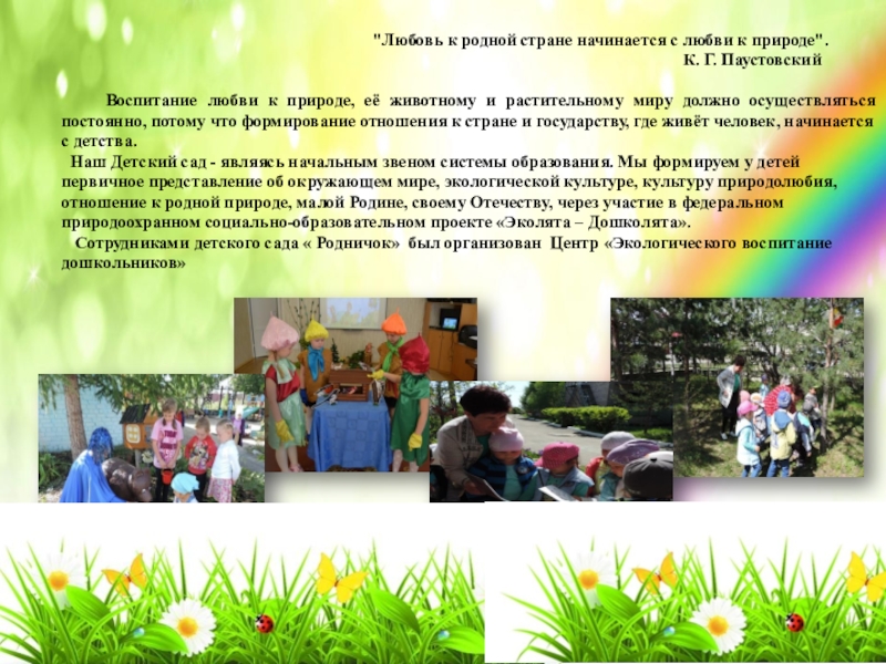 Воспитание любви к природе, её животному и растительному миру должно осуществляться постоянно, потому что формирование отношения к стране и государству, где живёт человек, начинается с детства.