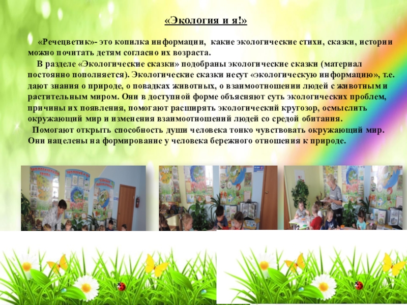 В разделе «Экологические сказки» подобраны экологические сказки (материал постоянно пополняется). Экологические сказки несут «экологическую информацию», т.е. дают знания о природе, о повадках животных, о взаимоотношении людей с животным и растительным миром. Они в доступной форме объясняют суть экологических проблем, причины их появления, помогают расширять экологический кругозор, осмыслить окружающий мир и изменения взаимоотношений людей со средой обитания.