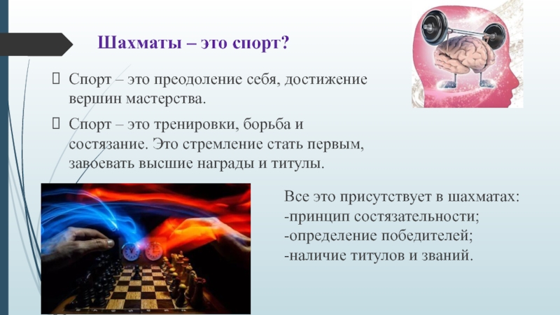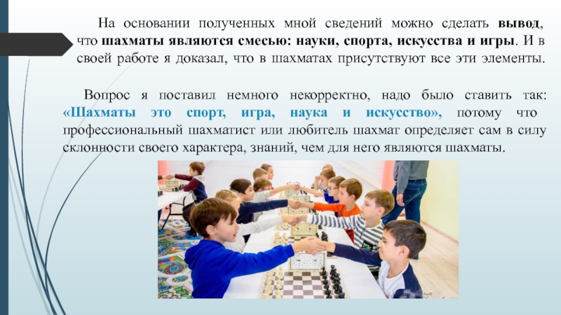 Вопрос я поставил немного некорректно, надо было ставить так: «Шахматы это спорт, игра, наука и искусство», потому что профессиональный шахматист или любитель шахмат определяет сам в силу склонности своего характера, знаний, чем для него являются шахматы.