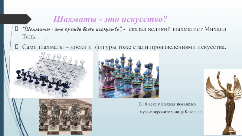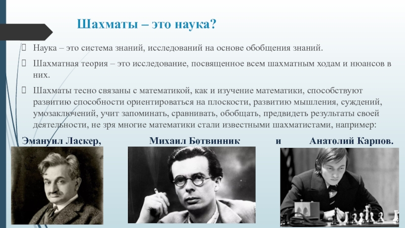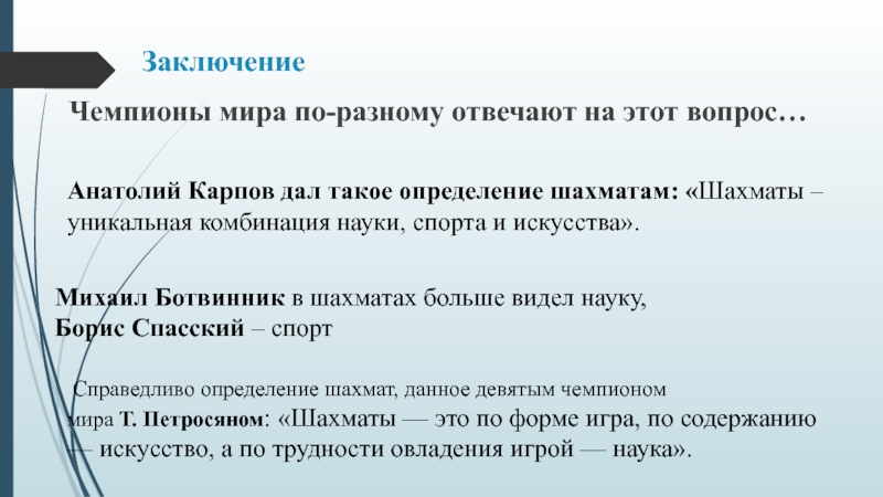 Справедливо определение шахмат, данное девятым чемпионом мира Т. Петросяном: «Шахматы — это по форме игра, по содержанию — искусство, а по трудности овладения игрой — наука».
