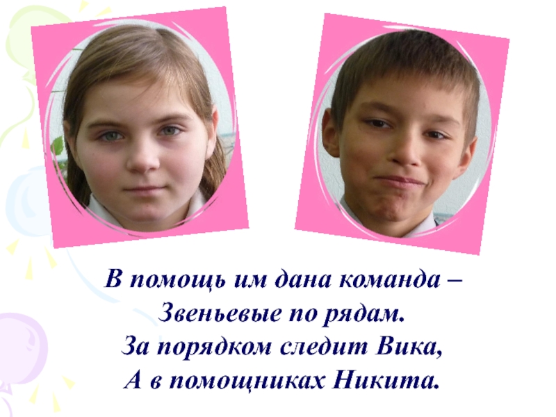 В помощь им дана команда –Звеньевые по рядам.За порядком следит Вика,А в помощниках Никита.