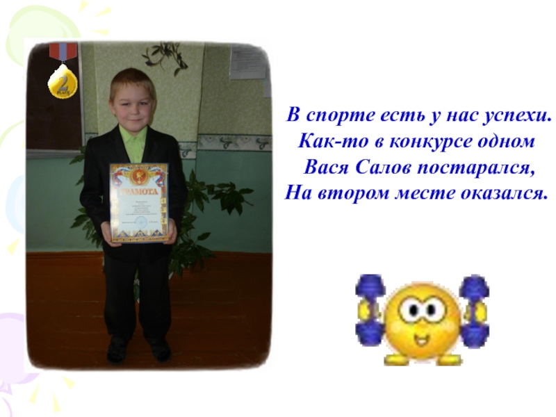 В спорте есть у нас успехи.Как-то в конкурсе одном Вася Салов постарался,На втором месте оказался.