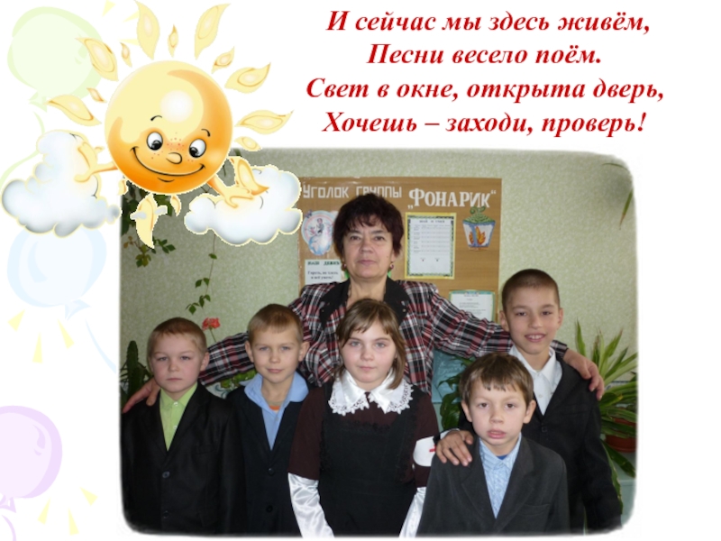 И сейчас мы здесь живём,Песни весело поём.Свет в окне, открыта дверь,Хочешь – заходи, проверь!