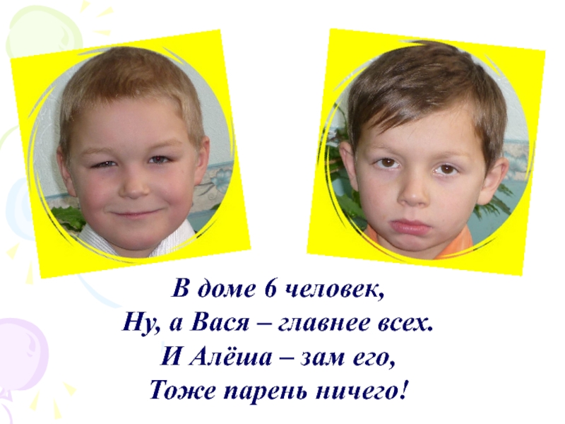 В доме 6 человек,Ну, а Вася – главнее всех.И Алёша – зам его,Тоже парень ничего!