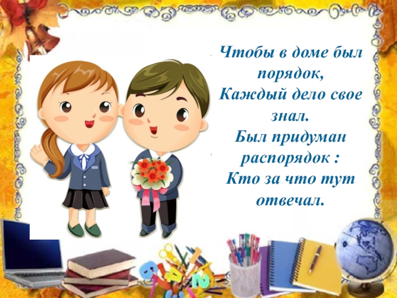 Чтобы в доме был порядок,Каждый дело свое знал.Был придуман распорядок :Кто за что тут отвечал.