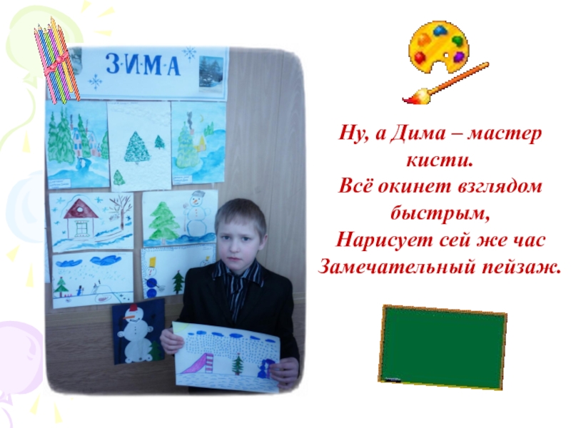 Ну, а Дима – мастер кисти.Всё окинет взглядом быстрым,Нарисует сей же часЗамечательный пейзаж.