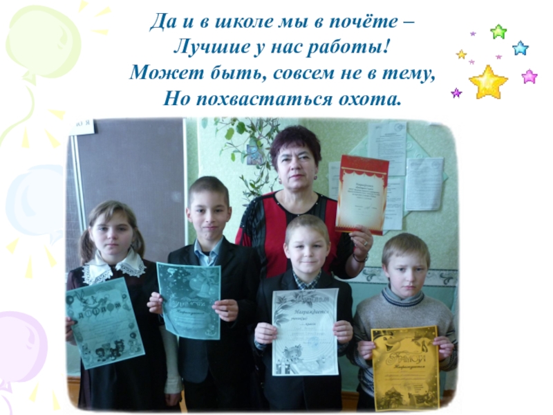Да и в школе мы в почёте –Лучшие у нас работы!Может быть, совсем не в тему,Но похвастаться
