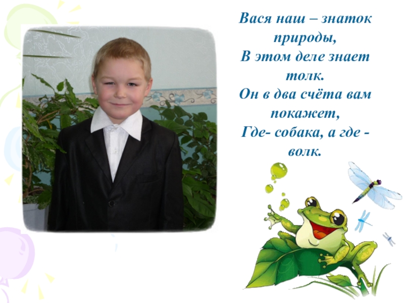 Вася наш – знаток природы,В этом деле знает толк.Он в два счёта вам покажет,Где- собака, а где