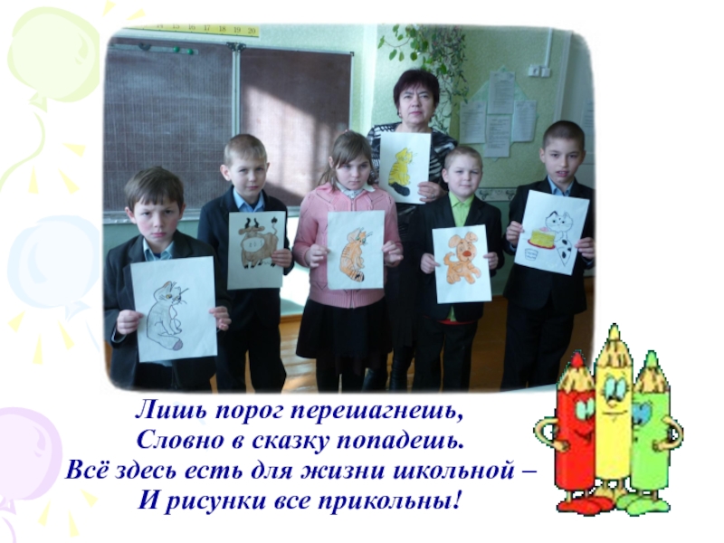 Лишь порог перешагнешь, Словно в сказку попадешь. Всё здесь есть для жизни школьной – И рисунки все
