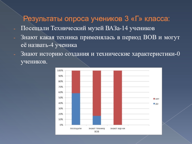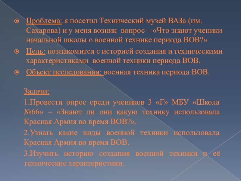 1.Провести опрос среди учеников 3 «Г» МБУ «Школа №66» – «Знают ли они какую технику использовала Красная Армия во время ВОВ?».