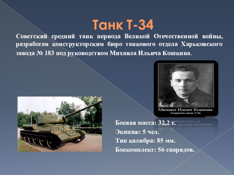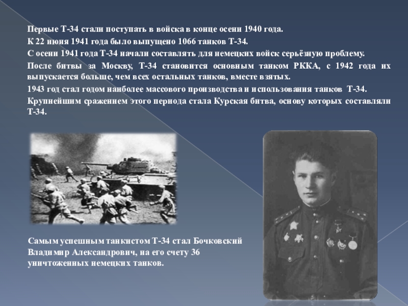 Самым успешным танкистом Т-34 стал Бочковский Владимир Александрович, на его счету 36 уничтоженных немецких танков.