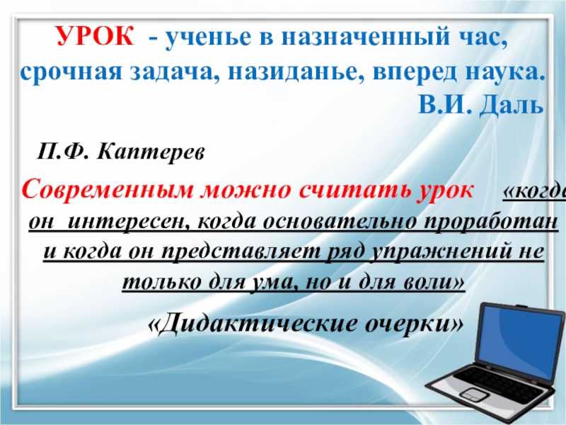 Современным можно считать урок «когда он интересен, когда основательно проработан и когда он представляет ряд упражнений не только для ума, но и для воли»