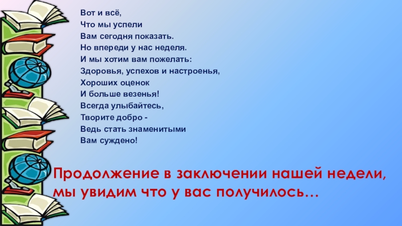 Продолжение в заключении нашей недели, мы увидим что у вас получилось…