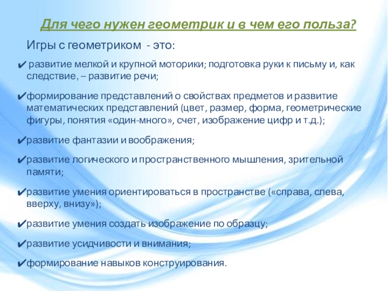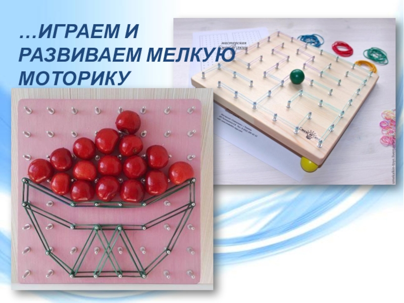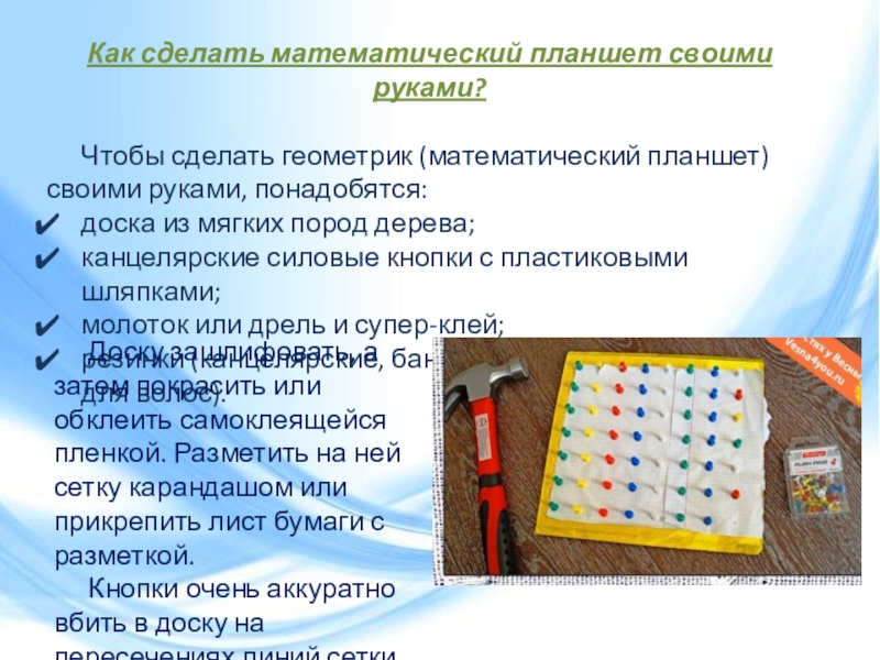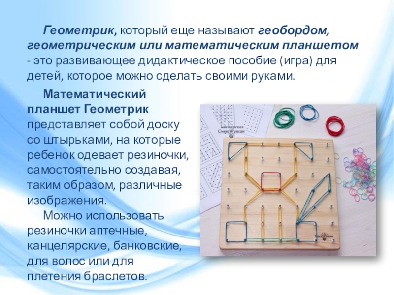Математический планшет Геометрик представляет собой доску со штырьками, на которые ребенок одевает резиночки, самостоятельно создавая, таким образом, различные изображения.