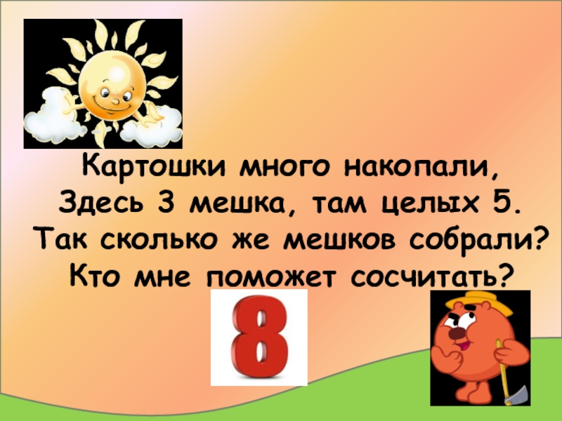 Слайд 4Картошки много накопали, Здесь 3 мешка, там целых 5. Так сколько же мешков