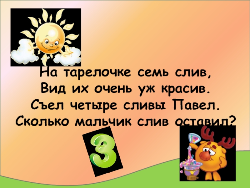 Слайд 6На тарелочке семь слив, Вид их очень уж красив. Съел четыре сливы Павел. Сколько