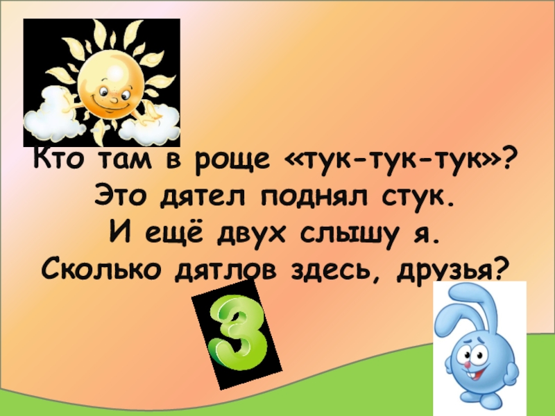 Слайд 3Кто там в роще «тук-тук-тук»? Это дятел поднял стук. И ещё двух слышу