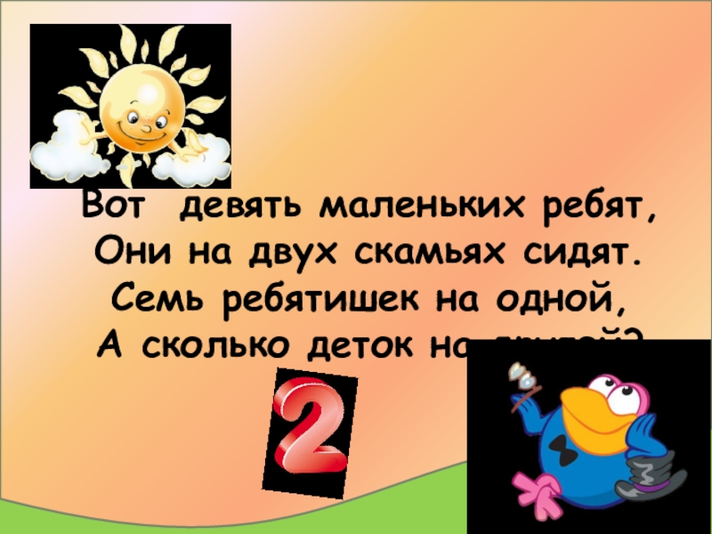 Вот девять маленьких ребят, Они на двух скамьях сидят. Семь ребятишек на одной, А сколько деток на