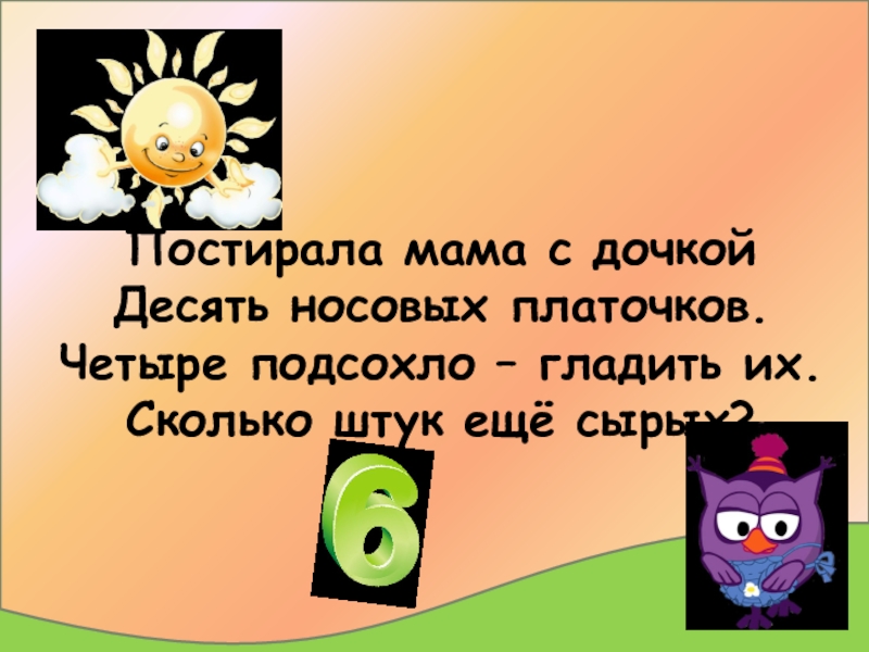 Постирала мама с дочкой Десять носовых платочков. Четыре подсохло – гладить их. Сколько штук ещё сырых?