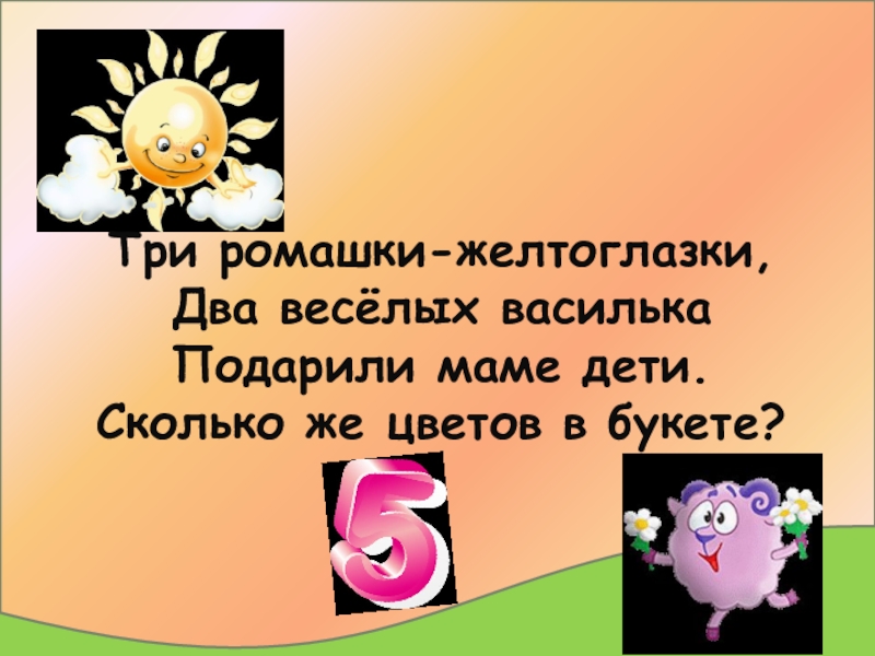 Слайд 2Три ромашки-желтоглазки, Два весёлых василька Подарили маме дети. Сколько же цветов в букете?