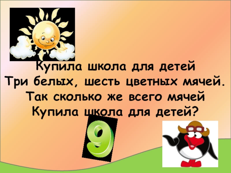 Слайд 10Купила школа для детей Три белых, шесть цветных мячей. Так сколько же всего