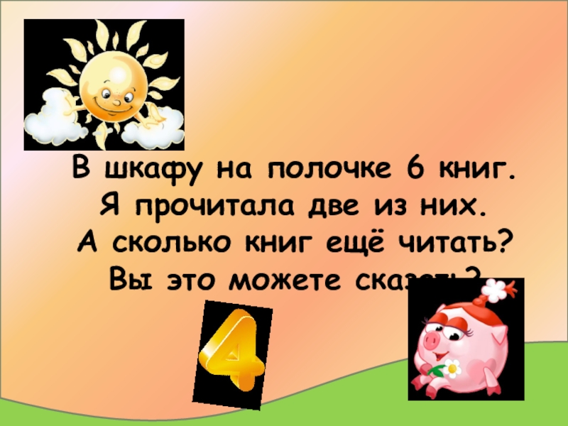В шкафу на полочке 6 книг. Я прочитала две из них. А сколько книг ещё читать? Вы