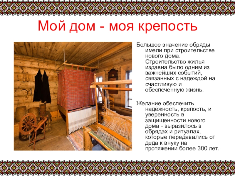 Желание обеспечить надёжность, крепость, и уверенность в защищенности нового дома - выразилось в обрядах и ритуалах, которые передавались от деда к внуку на протяжении более 300 лет.