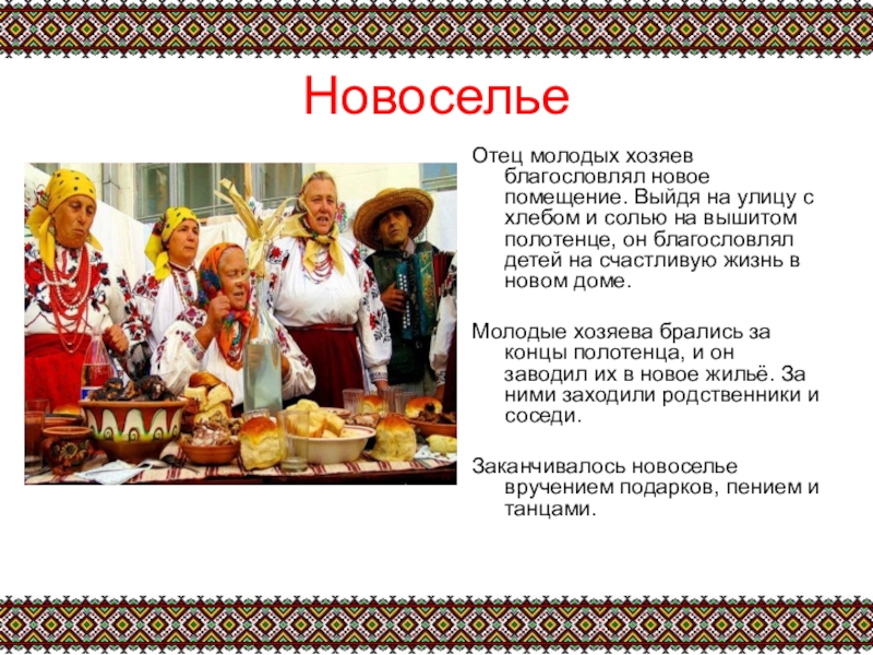 Молодые хозяева брались за концы полотенца, и он заводил их в новое жильё. За ними заходили родственники и соседи.
