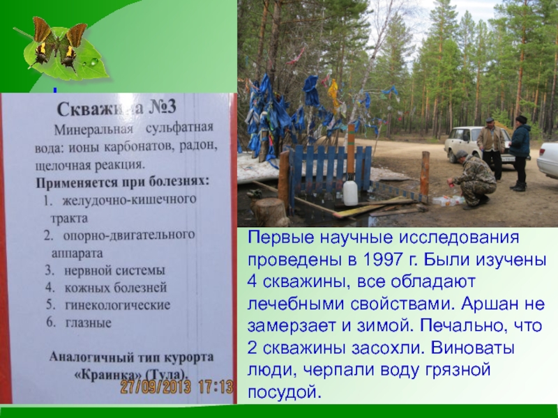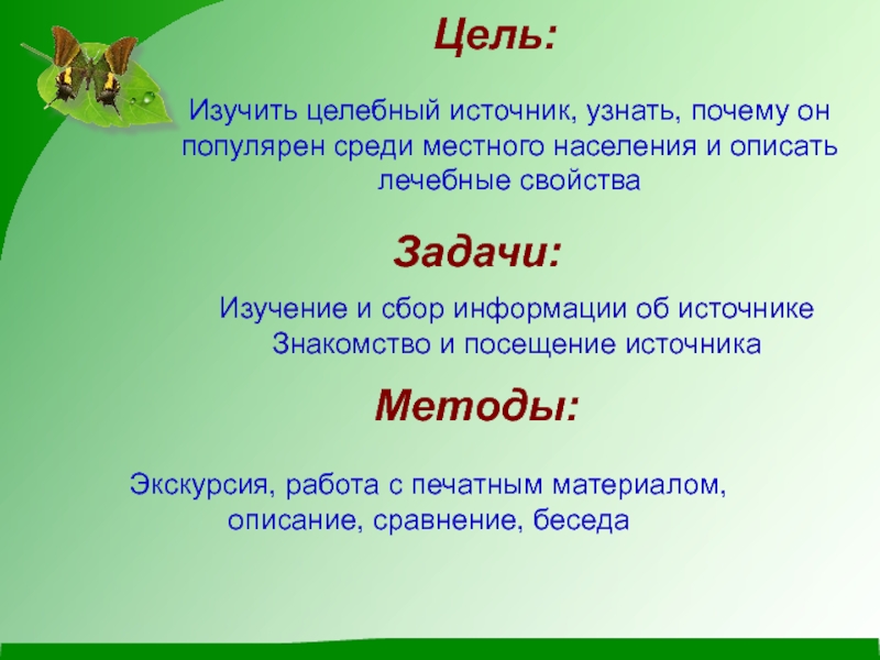 Изучить целебный источник, узнать, почему он популярен среди местного населения и описать лечебные свойства