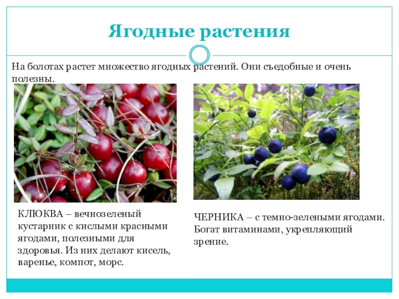 КЛЮКВА – вечнозеленый кустарник с кислыми красными ягодами, полезными для здоровья. Из них делают кисель, варенье, компот, морс.